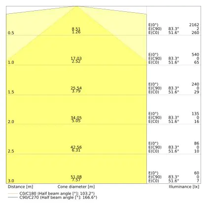 De lichtopbrengst (Lumen), geeft weer hoe krachtig het uitgestraalde licht is. Dit is belangrijk om te weten om de juiste sfeer te creëren. 0 tot 400 Lumen is bij uitstek geschikt voor accent- of sfeerverlichting. Een hoger aantal Lumen is, afhankelijk van de grootte van de ruimte, beter geschikt als ondersteunende- of basisverlichting. Heb je plafonds hoger dan 4 meter, dan is een lichtopbrengst van minimaal 8000lm aan te raden indien heldere verliching gewenst is (vb. in werkomgevingen).